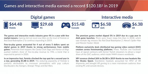 报告显示,2019年全球电子游戏收入若计入新兴互动媒体(游戏直播、VR、AR游戏),去年全球游戏规模达1201亿美元,总体增长了3%。