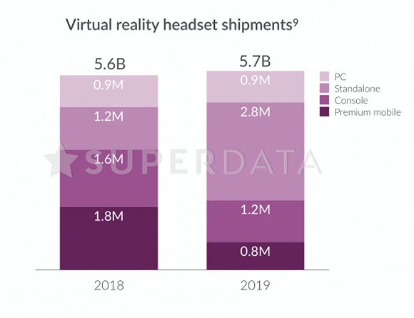 在VR、AR游戏(总称为XR)方面,OculusQuest等新型头戴式装置在2019年发售,推动此类游戏收入在2019年增长了26%,达到63亿美元,独立头戴式VR设备占总VR设备出货量的49%,并且将VR游戏带给了比现有PC和游戏主机设备更主流的受众群体。
