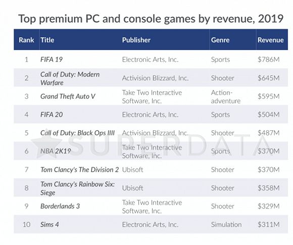 由于游戏主机即将进入下一个更新周期,以《使命召唤》《荒野大镖客》为代表的PC、主机大制作游戏面对的是一个寡淡的2019,收入同比下跌5%至189亿美元。营收最高的大制作游戏是EA的《FIFA19》,达到7.96亿美元,其次是《使命召唤:现代战争》和《侠盗猎车手5》。