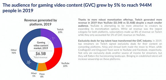 最有趣的现象是,尽管观众人数较少,但Twitch的收入却比YouTube多且专注,同时Twitch的订阅费占其总收入的8%。不过,各大平台正在加速热门GVC创造者。微软的Mixer、YouTube和Facebook都在花重金签约前Twitch热门主播,不过Twitch依然是全球最大的游戏直播平台,拥有超过9.44亿用户。