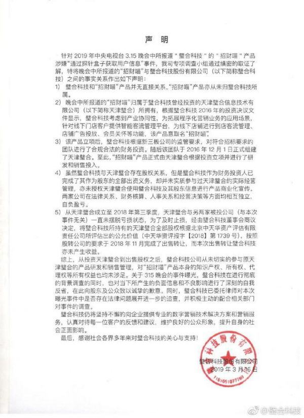 针对央视3.15晚会中所报道"璧合科技"的"招财喵"产品涉嫌“通过探针盒子获取用户信息”事件,璧合科技发布声明称:璧合科技和“招财喵”产品并无直接关系,“招财喵”产品亦从未归璧合科技所属,公司系财务投资,“招财喵”归属于璧合科技曾经投资的天津璧合所拥有。虽然璧合科技与天津璧合存在股权关系,但是璧合科技作为财务投资人已完成了其作为股东的全部出资义务,却并未实质参与过天津璧合的实际经营管理。