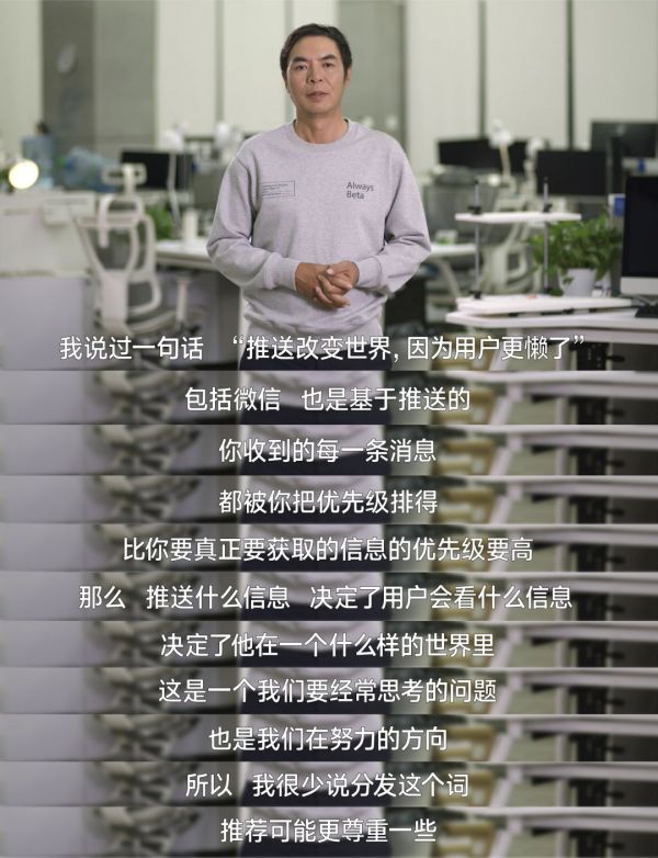 张小龙认为,“推送什么信息,决定了用户会看什么信息,决定了他在一个什么样的世界里。这是一个我们要经常思考的问题,也是我们在努力的方向。所以,我很少说分发这个词,我觉得推荐可能更尊重一些。”张小龙称,“信息的宽广度和质量,一直是微信要解决的问题。”