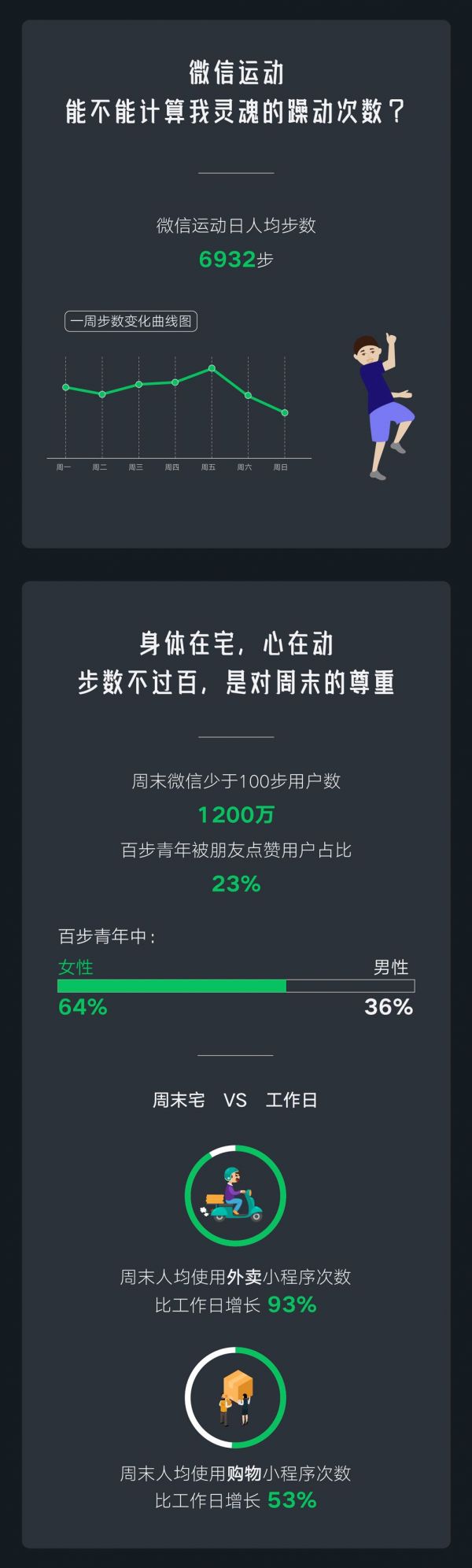 周末有1200万用户微信步数少于100步,其中女性占到64%。