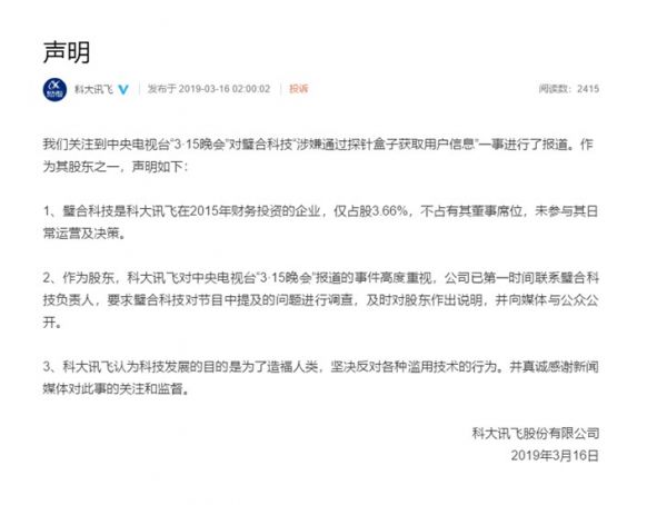 IT之家3月16日消息 央视315曝光了以机器人寻呼系统拨打骚扰电话的璧合科技,作为股东之一,科大讯飞发表声明称,璧合科技在2015年财务投资的企业,仅占股3.66%,不占有其董事席位,未参与其日常运营及决策,同时,坚决反对各种滥用技术的行为。
