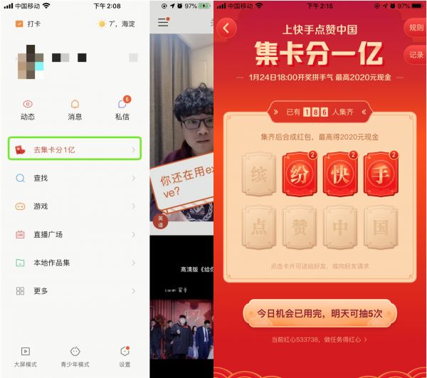 快手上线春节预热活动之“集卡分一亿” 最高拿2020元