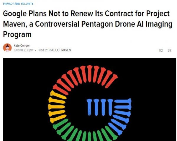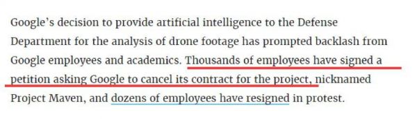 据悉,这两个项目一个是将谷歌的人工智能和大数据技术应用在美国国防部的无人机上,从而提升美国无人机的能力;另一个则是给美国军方提供云计算和存储服务。根据英国路透社的报道,尽管美国国防部给谷歌开出了数亿美元的丰厚合同,谷歌最终还是以项目有悖于谷歌的企业价值而选择了放弃,其中谷歌公司的员工也给管理层施加了很大的压力,联名反对公司把AI技术用于给军方开发武器上。
