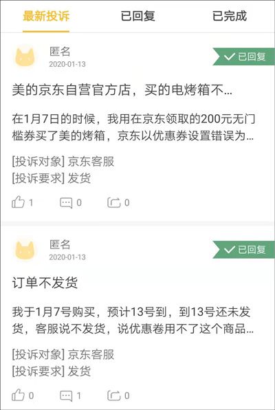 目前,观察者网在某投诉APP上看到,因在京东使用优惠券低价购买小家电后未发货的投诉案例已有多起,投诉者均称京东有虚假宣传、欺骗消费者的嫌疑。