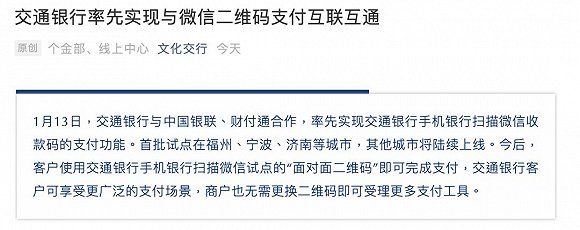交行公告显示,1月13日,交通银行已经率先实现与微信二维码支付互联互通,且该合作为旨在落实人民银行关于推进条码支付互联互通的指导意见,并促进条码支付市场向更加高效、规范、安全的方向发展。