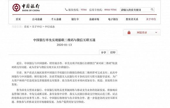 中国银行在官方网站表示,中国银行与中国银联、财付通合作,率先实现手机银行扫描微信“面对面二维码”收款码的支付功能,成为首家与微信实现互认互扫的银行。目前,客户在试点地区使用中国银行手机银行扫描微信的收款二维码即可完成支付。