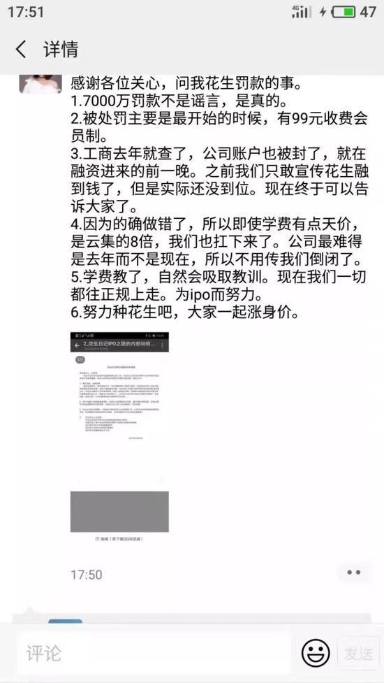 网传花生日记内部人士在朋友圈承认了花生日记被处罚一事,该内部人士表示,巨额罚款不是谣言,但公司并没有倒,未来将规范化努力IPO。