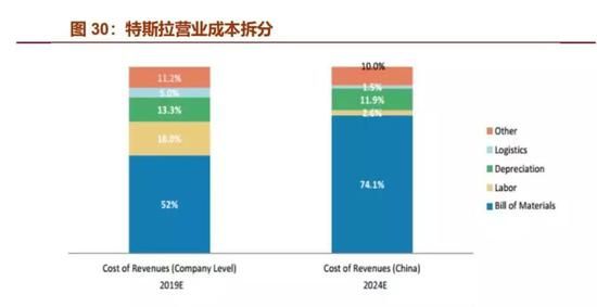 由上图可见,成本占比最高的是原材料成本,据MorganStanley测算,目前原材料约占营业成本的50%以上,未来随着特斯拉的生产重心向中国转移,人力运输成本压缩,原材料占比将进一步提高到70%以上。