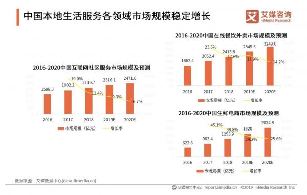 iiMedia Research(艾媒咨询)在《2019上半年中国本地生活服务行业市场监测报告》中指出,2016至2018年中国在线餐饮外卖、互联网社区服务、生鲜电商市场均保持平稳增长,其中在线餐饮外卖仍拥有较高市场规模,预计2019年达到2845.5亿元;各平台未来应在提升用户体验外,加强对于商家赋能的布局,推动商家数字化升级,以及根据用户消费行为为商家提供改进建议。