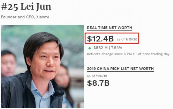 福布斯实时富豪榜数据显示,截至目前,雷军的总财富为124亿美元(约合人民币850.5亿元),比上一个交易日(即本周五与本周四相比较)增加了8.82亿美元。而在去年11月发布的福布斯2019中国富豪榜上,雷军的身家还“只有”87亿美元(约合人民币596亿元)。