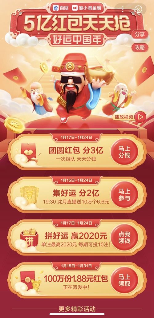 15日,百度正式宣布启动“好运中国年”活动,从15日0:00到24日24:00,用户可以通过“集好运”和“团圆红包”两大玩法瓜分今年的5亿元红包。