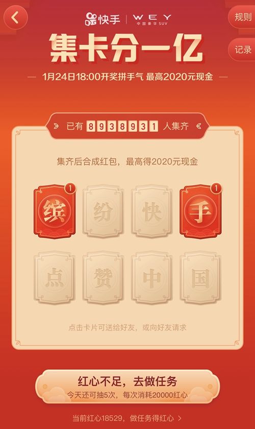 另外,用户还可在快手APP上参与抽卡,集齐“缤纷快手,点赞中国”对应字符的8张卡,在24日(除夕)当天18:00瓜分1亿元和大量快币。