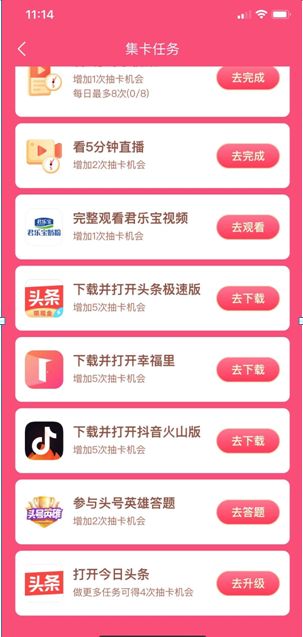 而抖音上,则是金卡和钻卡等着你。首先是集金卡,集齐“发财中国年”五个字的金卡参与平分3亿红包;集完金卡集钻卡,每集齐一套金卡可以合成一张钻卡,当你集齐“抖音”、“今日头条”、“西瓜视频”、“Faceu激萌”、“轻颜相机”和“皮皮虾”等6款产品logo的钻卡后,就有了参与平分2亿红包的资格。而要想领到更多红包雨,下载今日头条、今日头条极速版、抖音、火山小视频、西瓜视频、皮皮虾、Faceu激萌、轻颜8个APP一个都不能少。