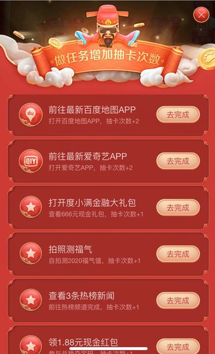 以去年与春晚合作的百度为例,用户需要集齐10张好运卡,在除夕夜瓜分2亿现金红包。但百度APP不是唯一的入口,想要获得更多抽卡机会,要去好看视频看10秒、七猫小说看30秒、百度贴吧APP看帖子10秒、语音搜一下新闻热词、打开度小满金融大礼包,再前往最新的爱奇艺、百度网盘、百度地图等APP,更多好运才能扑向你。