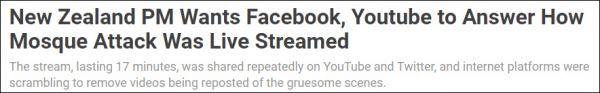 在此次枪击事件中,凶手通过脸书和油管等网站对自己行凶的整个过程进行了直播,而这些网站直到17分钟后才发现此事并封掉了他的直播间。