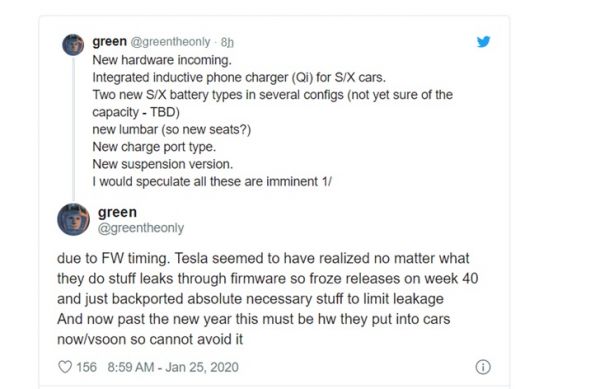 这些新功能是研究人员@Greentheonly 发现的,他在这次的系统更新代码中发现了2020款Model S以及Model X将会拥有新的电池类型(此前马斯克也曾证实,新的Model S会有比现在更大的电池组),还有新的靠垫、新的充电端口类型,另外,他发现代码中还透露了2020款Model S以及Model X应该会配备新的内置Qi无线充电器。
