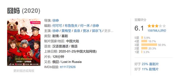 截至1月26日8时许,《囧妈》豆瓣评分6.1分,已有超过15万人评分。