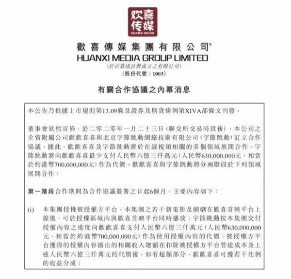 所谓的“利益驱使”,根据欢喜传媒发布的公告,字节跳动将向欢喜传媒全资子公司欢欢喜喜最少支付6.3亿元,而此前24亿的保底发行协议终止。《囧妈》以及其他影视等版权若有超过6.3亿的收益,欢欢喜喜还能获得若干比例的收益分成。