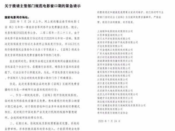 这份文件内文称,《囧妈》进行互联网免费首播的行为,“意味着现行的电影公映窗口期已被击碎,对于影院营收和行业多年来培养的付费模式相左,是对现行中国电影产业及发行机制的践踏和蓄意破坏”;“明显违背了全球通行的点一个行业规则,违背公平竞争的市场原则,将对整个中国电影产业的健康发展造成极为不利的影响”。