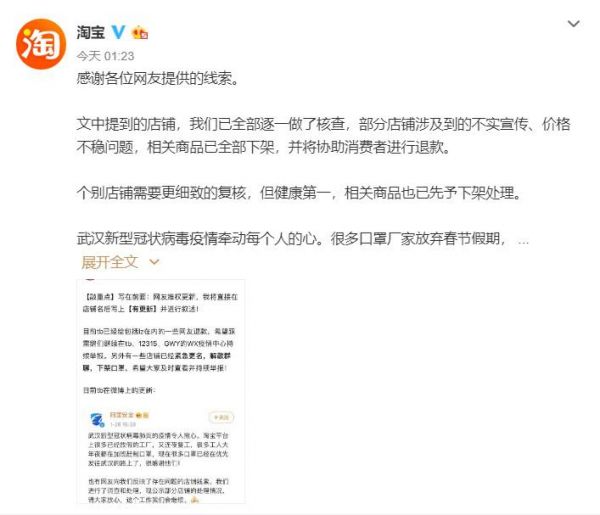 IT之家 1月27日消息 先前有网友称部分淘宝店铺口罩出现不实宣传、价格不稳的情况。对此淘宝官方于昨日发布微博称已对相关店铺全部逐一核查,对相关商品作下架处理,后期将协助消费者退款。