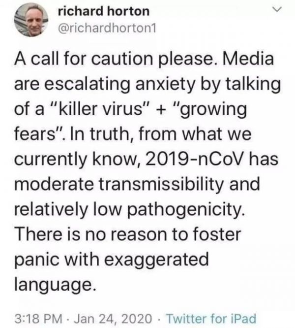 国际医学期刊《柳叶刀》的主编就在社交平台上发言提醒媒体正通过把该病毒称作“杀手病毒”+“助长恐慌”将事件升级。事实上,该病毒有着中等/一定传染性、相对低的致病性。用过度夸张的语言来“培育”恐慌是完全没有必要的。