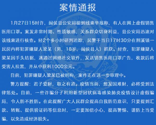1月27日15时许,闽侯县公安局接到线索举报称,有人在网上虚假销售医用口罩。案发非常时期、性质敏感,关系群众切身利益,县公安局迅速对该线索进行核查。经2个多小时研判追踪,民警于当日17时30分在荆溪镇一民房内将犯罪嫌疑人梁某(男,18岁,闽侯县人)抓获。经查,犯罪嫌疑人梁某因手头拮据,遂通过网络社交软件,发送销售医用口罩广告,收款后将受害人拉黑,并从中获利1000余元。