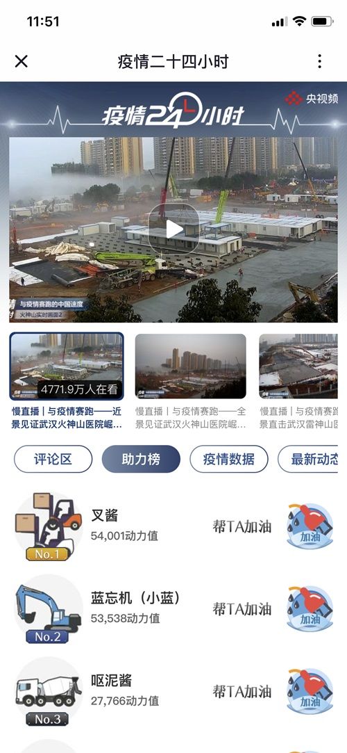 目前,火神山医院和雷神山医院建设直播在线观看人数已超过三千万。同时,央视也为其增设了助力榜,用户无需消费,点击加油即可参与打榜。