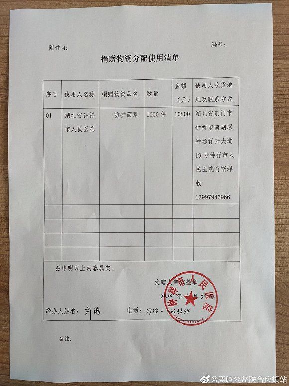 捐赠物资分配使用清单 我们开了一个666联盟的微信群,群内成员线上联系,只要有消息我们便在群内互通,大家互帮互助。所购物品只要是符合资质的,我们基本上不太用讨论。现阶段要找合适的货源实在是太难了,所以只要有货,只要医院能用我们就买,大家量力而行。
