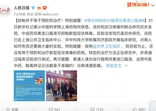 网易科技讯 2月1日消息,刚刚,人民日报再次发布微博,提醒到目前为止,还没有用于预防和治疗新型冠状病毒的药物,希望普通人请勿自行服用双黄连口服液,运用中医中药,脱离辨证论治都是不准确的!治病请遵医嘱。