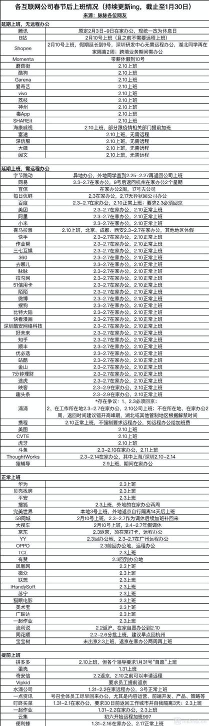 不过,有些特殊部门或者公司已经开始要求提前返岗,比如一些地方的体制内人员因疫情需求,接到了提前返岗的通知;有些公司则是按照国务院要求2月3日起正常上班,比如华为、联想、微众银行等;有些则2月3日-2月7日在家远程办公,2月10日上班。