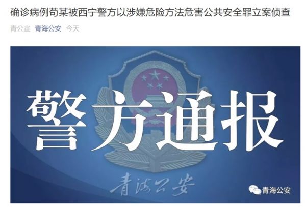 今日上午,青海公安通报称,确诊病例苟某被西宁警方以涉嫌危险方法危害公共安全罪立案侦查。