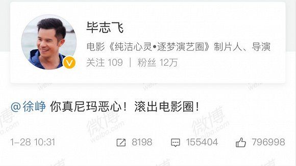 除了一个人,曾执导号称豆瓣电影最低分影片《逐梦演艺圈》的导演,毕志飞。“ 徐峥你真尼玛恶心!滚出电影圈!”是他近几日发布的关于徐峥的14条微博中,最简短、最激烈的一条。