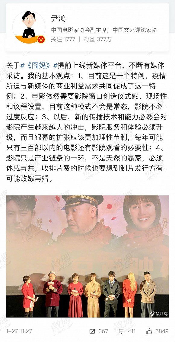 在他看来,徐峥及欢喜传媒让《囧妈》以免费的形式在线上进行播放遭遇院线抵制,并没有上升到线上平台与流媒体之争的高度,仅仅是因为主打院线上映的《囧妈》在影片上映之前,占据了影院大量的人力、物力,以及宣传资源,《囧妈》片方“违反《影片分账发行放映合同》,擅自单方面变更的‘失信’和扰乱行业”。