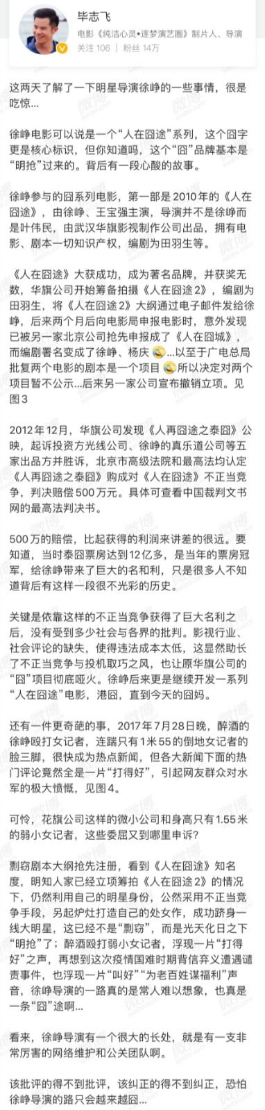 此后,毕志飞也发布了一些关于徐峥在此前关于作品侵权、以及私生活的照片与新闻。在他看来,当时的那些解释,都是“很难令人信服的说法。我不是要把旧闻传播一遍,我是想他做出一个回应。当时他的回应太糊弄人了,他的这些行为给人感觉他很不诚信。不管是把我看作一部烂片导演来看,还是非行业的普通人来看,我都有这个(质疑的)权利。”