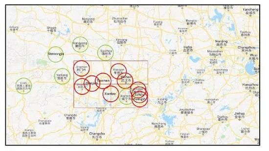 Michael Levitt教授将数据分为湖北省和其他地区(非湖北省),绝大部分死亡病例集中在湖北省武汉市和天门市附近90公里×35公里范围内(见下图)。湖北省死亡率大于1%的城市标注红圈,小于0.5%的城市标注绿圈: