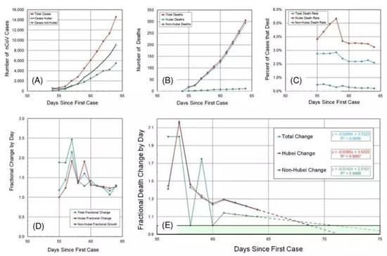 图(A)显示累计确诊人数在持续增加;图(B)显示几乎所有死亡病例都在湖北(超过95%);图(C)显示湖北的死亡率很高,但在其他地方则较低(湖北是其他地方死亡率的16倍),其他地方死亡率与流感的死亡率相当,约为0.2%;图(D)显示在所有三个统计范围(湖北、其他地区和合计)的确诊病例人数发生了不可预测的变化。在所有指标中,这些数字似乎最不可靠;图(E)显示人数的增长越来越缓慢,也就是说,当日死亡人数除以前一日死亡人数的比率正在减小。