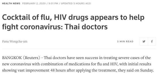 泰国医生:新冠肺炎患者服用抗流感和抗艾滋的混合药物后好转