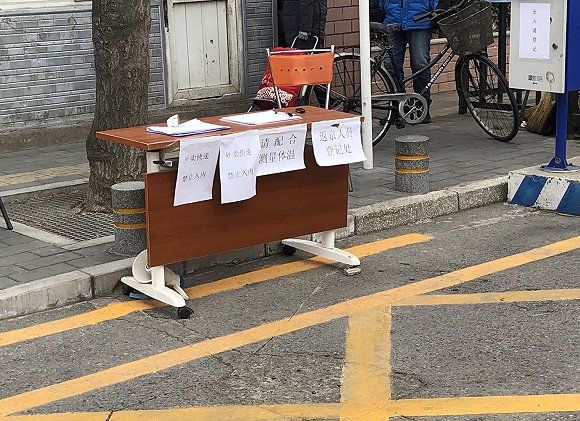 一位北京的外卖骑手告诉界面新闻,近期北京的小区都已经封闭式隔离,外卖骑手、快递员等均不得入内,都需要客户到小区门口去取。很多小区入口处没有可以集中放置外卖的区域,或者小区的住户规模太大,最终还是消费者从骑手手里接过外卖。也有不少小区在入口处设置了下图这样的工作点,不允许外卖快递进入。