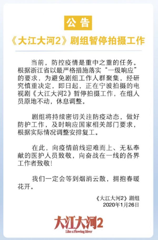 除了电影,各类剧集目前也处于停滞状态。如1月27日,赵丽颖、王一博主演的《有翡》宣布暂停拍摄,由正午阳光出品的《大江大河2》也在同日宣布暂停拍摄。