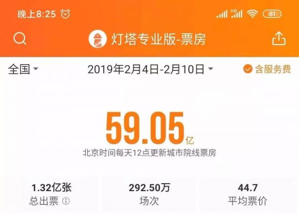 2019年春节档7天收获59.05亿元票房(图片来源:灯塔专业版)