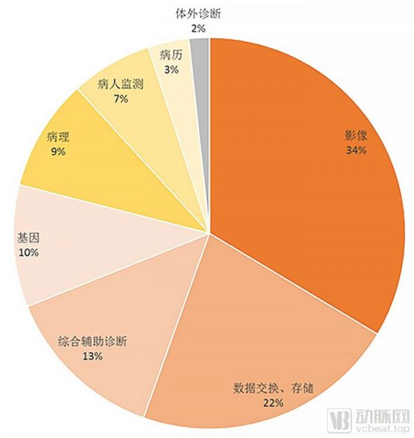 人工智能的最终目标是像专家一样能实现单独综合诊断,然而目前最成熟的应用还是集中在单个项目上,尤其影像领域。我们统计了AI+辅助诊断领域的120家企业,其中影像类辅助诊断占比最高(34%),其次是数据整合存储(占比22%)。