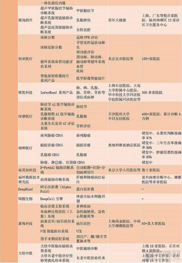 根据依赖应用服务对象、使用医疗环节、医疗应用病种范围,报告制作了医疗人工智能应用矩阵,并对我国医疗人工智能行业进行了总结,制作出了医疗人工智能行业图谱。