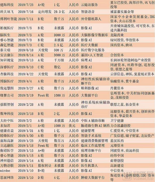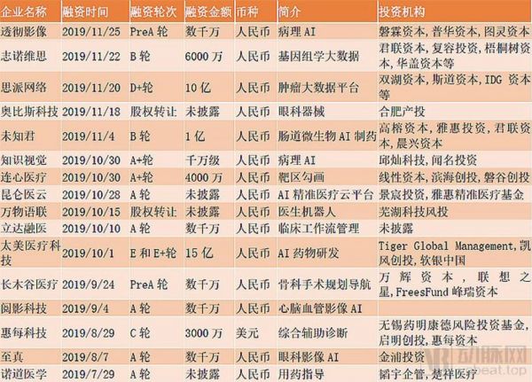 2019年完成融资的部分医疗AI企业(截止2019年11月)