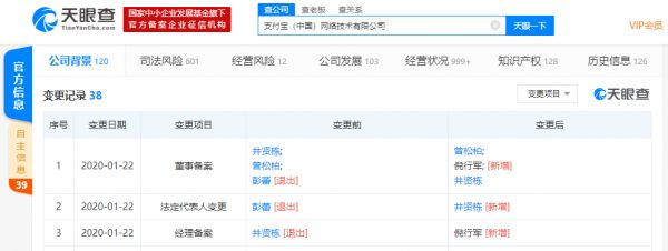 网易科技讯 2月6日消息,天眼查数据显示,1月22日,支付宝的运营主体支付宝(中国)网络技术有限公司发生工商变更,彭蕾卸任法定代表人和董事,其中法定代表人由井贤栋接任,董事由倪行军接任。与此同时,井贤栋还卸任经理一职,由倪行军接任。