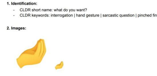 这个表情包是在今年1月份才正式推出和收进万国码Unicode的。该符号的发明者称,意大利人讲话时喜欢用各种手势,因此,这个手势符号想表达的是一个问句。