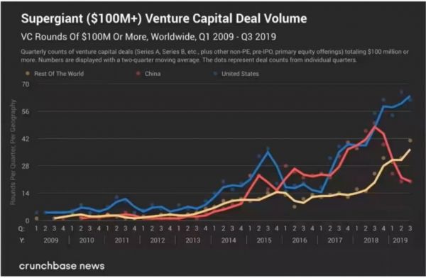其实我自己最大的担心是这次会不会导致国际资本对中国的投资减少。2019年下半年,我自己已经明显感觉到国际资本对中国的投资减少,这一趋势2020年会不会加速,转而把钱投到东南亚和南亚去,这点是我自己没有想的特别明白,也是一直在思考的问题。还有一些其他层面的东西,比如说提前预测、随机应变,抓政府政策,抓住发展规律等。下面这张图反映从2019年开始融资就急剧的下降。