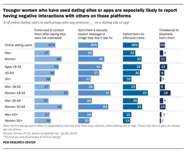 不过,随之带来的问题也在增加,比如骚扰问题。报告显示,有37%的在线约会用户表示某个网站或应用上的某人表示对他们不感兴趣后继续与他们联系; 35%的人表示他们收到了他们不要求的明确消息或图片,而28%的人表示叫一个冒犯的名字,另有9%的人表示他们受到身体伤害的威胁。